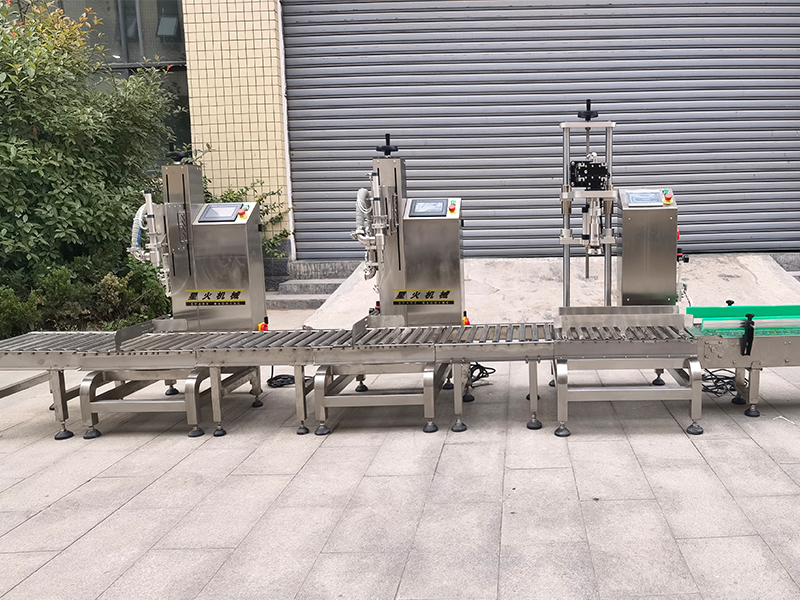 單頭稱重灌裝生產(chǎn)線基礎(chǔ)重量感應(yīng)操控、自動化技術(shù)、稱重檢測、貼標(biāo)等配置,顯示對桶裝物料的精準(zhǔn)灌裝,大型灌裝機(jī)整套設(shè)備是由進(jìn)料系統(tǒng)、稱重系統(tǒng)、灌裝頭以及可編程控制器來完成,它的操作方法快速便捷,單頭稱重灌裝生產(chǎn)線在啟動后,物料通過管道,在重力作用下,從儲料罐內(nèi)進(jìn)入進(jìn)料系統(tǒng),進(jìn)料系統(tǒng)則通常會配備閥門,灌裝啟動后,物料將會以較大流量快速注入進(jìn)容器,此時系統(tǒng)處于快速灌裝模式,此時的容器在接受到物料充填后,重量將增加,稱重感應(yīng)系統(tǒng)將會實時檢測并持續(xù)向PLC傳輸重量數(shù)據(jù)信息,在達(dá)到預(yù)設(shè)的灌裝量后,PLC控制系統(tǒng)發(fā)出指令,并關(guān)閉閥門,完成一次精準(zhǔn)灌裝工作,隨后單頭稱重灌裝生產(chǎn)線的灌裝頭提升復(fù)位,同時容器將會帶入至上蓋工位,快速精準(zhǔn)的對準(zhǔn)容器口進(jìn)行蓋上蓋子,于此同時,旋蓋機(jī)已經(jīng)開始為旋蓋工作做準(zhǔn)備,如此往復(fù)循環(huán)。
