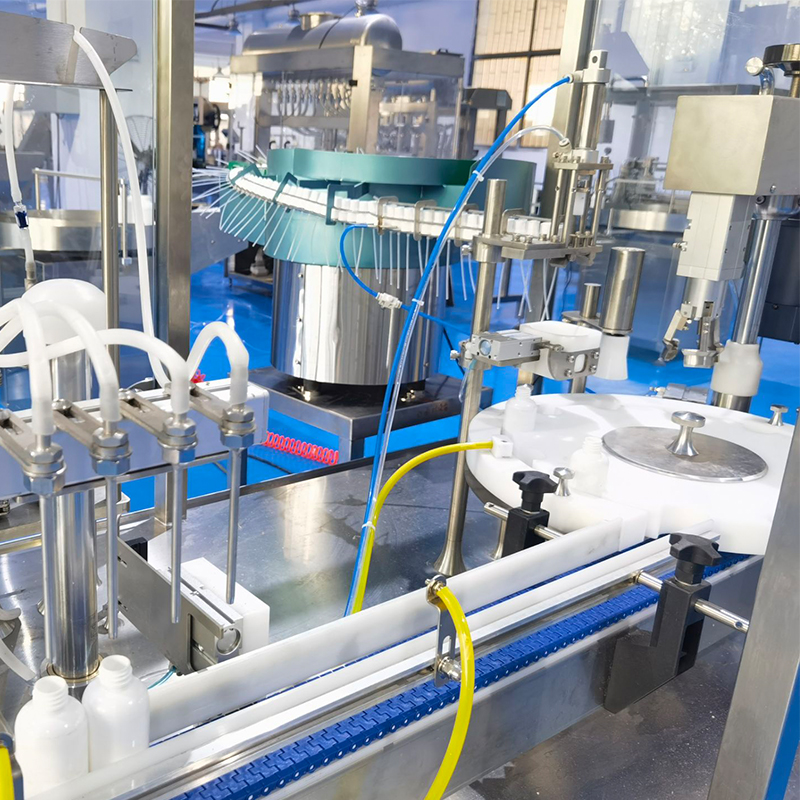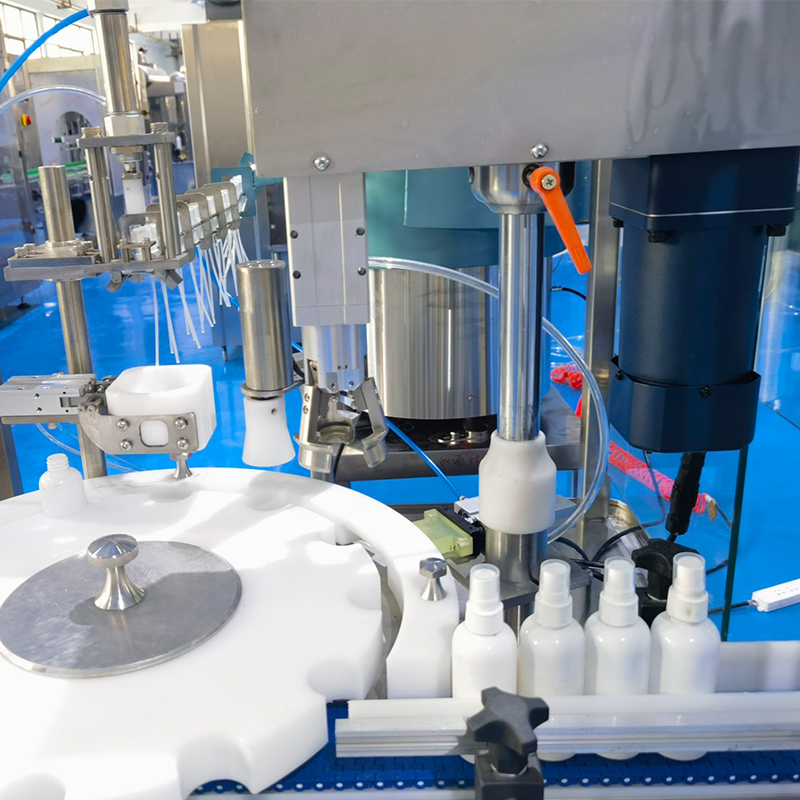 在正式開始工作前,將待灌裝的容器放置在理瓶機(jī)內(nèi),待灌裝的容器理瓶機(jī)有序的帶送至灌裝區(qū)域,小型自動(dòng)灌裝旋蓋一體機(jī)的灌裝部分處于封閉式的工作環(huán)境,方便用戶觀察生產(chǎn)流程的同時(shí)保證灌裝食材的安全性,液體灌裝機(jī)設(shè)備的輸送部分是以變頻調(diào)速技術(shù),通過靈活調(diào)整容器的輸送速度,當(dāng)容器抵達(dá)灌裝工位時(shí),定位裝置會(huì)精準(zhǔn)的檢測(cè)到瓶子的狀態(tài),定位完成后,灌裝頭會(huì)根據(jù)預(yù)設(shè)的灌裝量,通過高精度的定量裝置進(jìn)行液體定量的抽取與灌注。對(duì)于低粘度的液體物料,小型自動(dòng)灌裝旋蓋一體機(jī)運(yùn)用流量計(jì)的灌裝方式,通過控制液體的流速和時(shí)間,精確控制灌裝量,當(dāng)達(dá)到預(yù)設(shè)的灌裝量時(shí),灌裝頭會(huì)迅速關(guān)閉,防止液體溢出,確保每瓶商品灌裝量的一致性輸出,確保生產(chǎn)誤差在極小的范圍內(nèi)完成。液體灌裝機(jī)設(shè)備在灌裝完成后,定位系統(tǒng)將會(huì)打開,容器將繼續(xù)沿著輸送帶前行,進(jìn)入旋蓋工位。與此同時(shí),瓶蓋通過振動(dòng)盤進(jìn)行有序排列和輸送,使其以正確的姿態(tài)被送至旋蓋頭下方。液體灌裝機(jī)設(shè)備在旋蓋過程中,旋蓋頭旋轉(zhuǎn)并下壓,將瓶蓋緊密旋合在瓶口上,既保證瓶蓋密封嚴(yán)實(shí),防止液體泄漏,又避免因旋蓋力度過大損壞瓶蓋和瓶身。